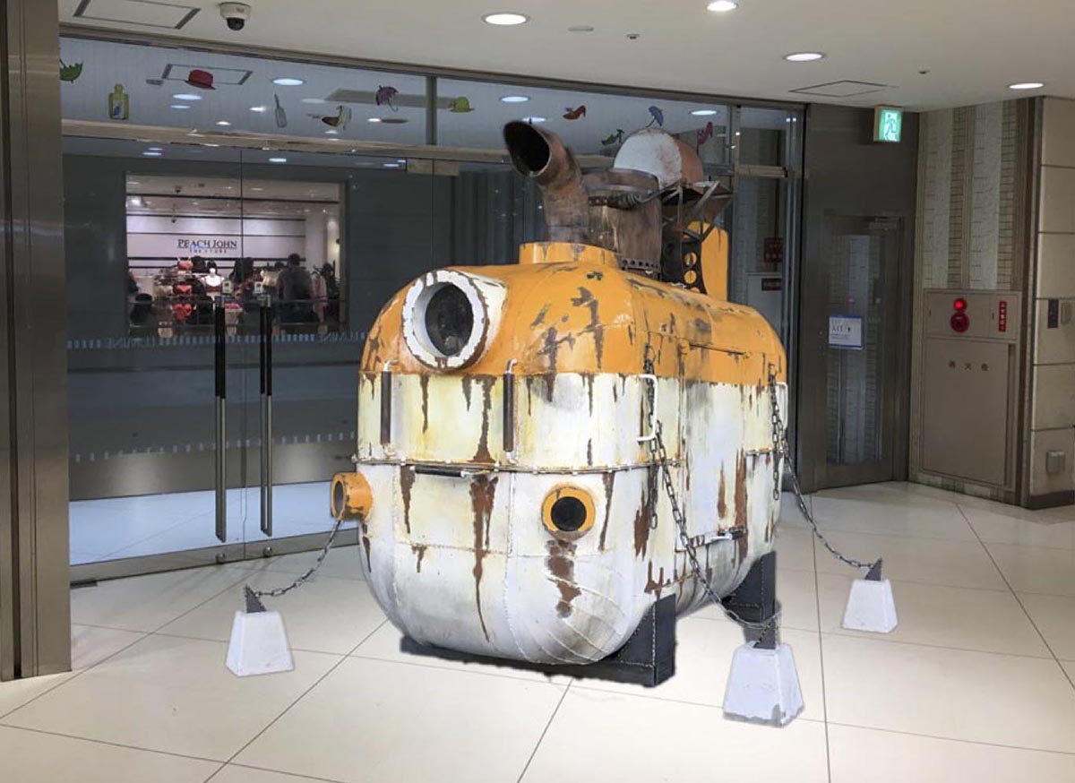 潜水艦のようなカタチをしたこの作品は中に3つの水琴窟が入っています。水琴窟とは神社の地中などに埋められていて、砂利を伝って落ちてきた柄杓の水を反響させて「1/fゆらぎ効果」とよばれる癒しの音を響かせる壷のことです。作品の上部に備わる樽に雨水を溜め込み、内部のパイプのそれぞれの蛇口の締め具合で水滴の落ちるスピードを調整し、自身の気分に合う最適なテンポのリラクゼーション音を体感することが出来ます。扉を閉めた作品の内部は薄暗く静かで、水音の反響するおちつく空間になっています。