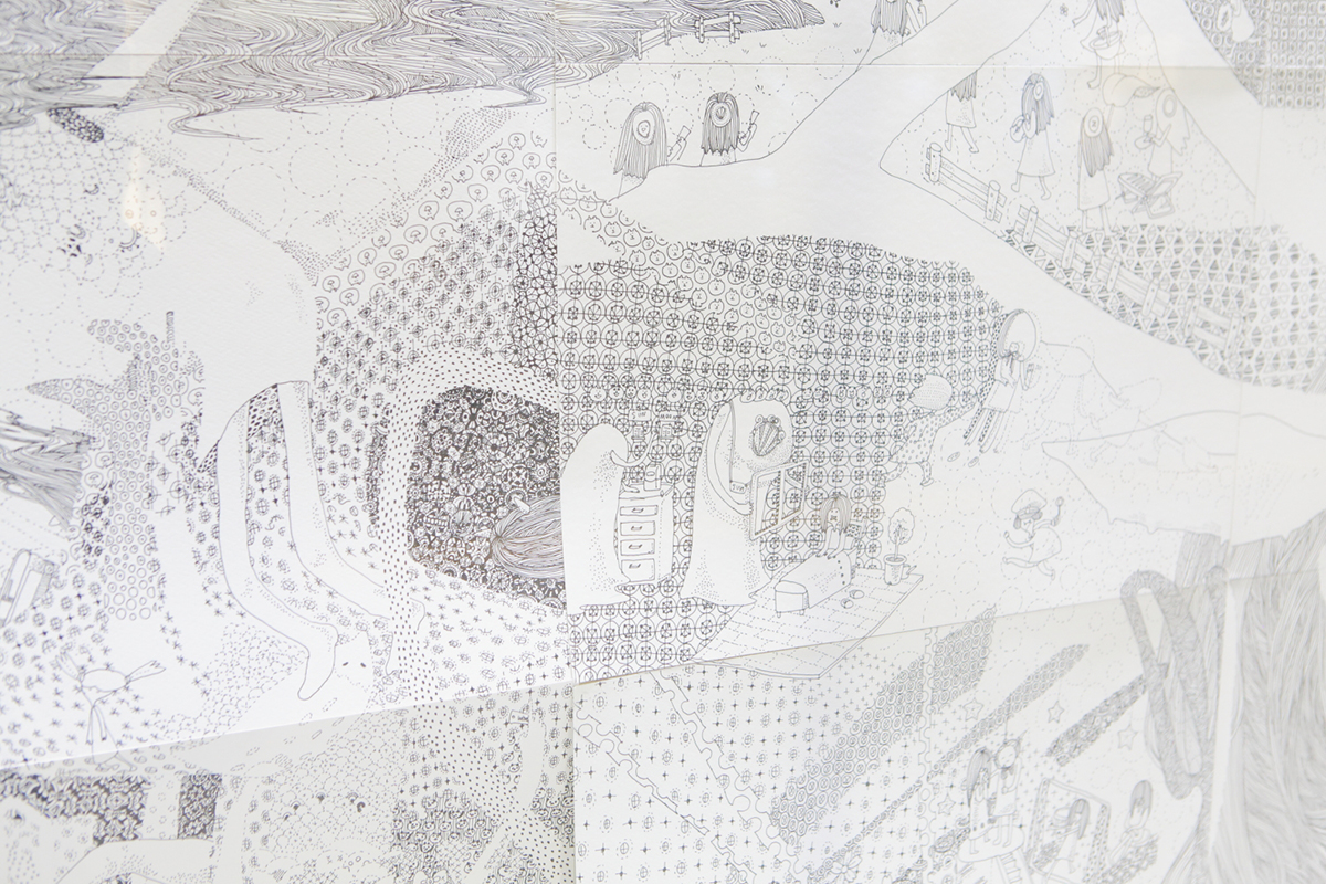 - フォーカスをどこに置くかで、見えるものは変わってくる。この世界の真理を体現する作品。緻密で丹念なペン画をじっくり見てみると、「多様な物語」が描かれていることを知る。そして描き足し続けることで、世界は広がり続ける。その終わりのない世界には、人々の欲望や苦悩がポップでコミカルなタッチで描かれている。見る者のフォーカス次第で世界が変わり、「世界には完成がない」ことが、この作品の最大の魅力である。