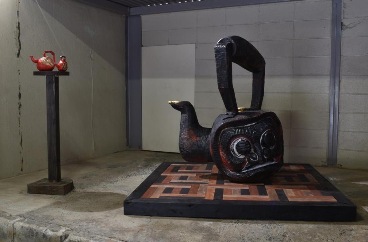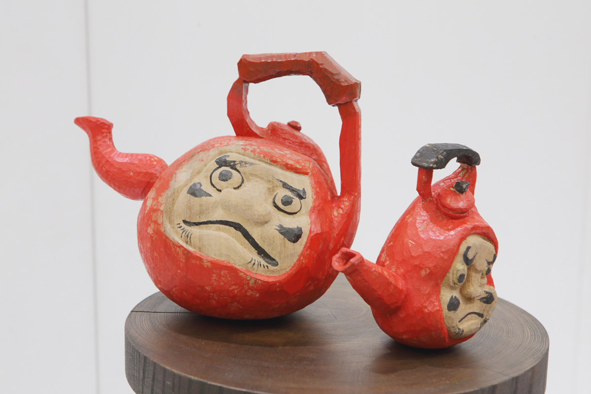- 一度見たら決して忘れられない、強烈なインパクトのある作品です。使われているのは漆、柿渋、金箔などの伝統的な素材や技法ですが、ダルマの顔をもつ無骨な作品のフォルムは、ユーモラスであるとともに、おどろおどろしく、「縄文的」な情念すら感じられ、そのミスマッチ感が作品の最大の魅力になっています。都会的感覚のルミネのスペースで、この作品がいったいどんな出会いをもたらしてくれるのかとても期待されます。