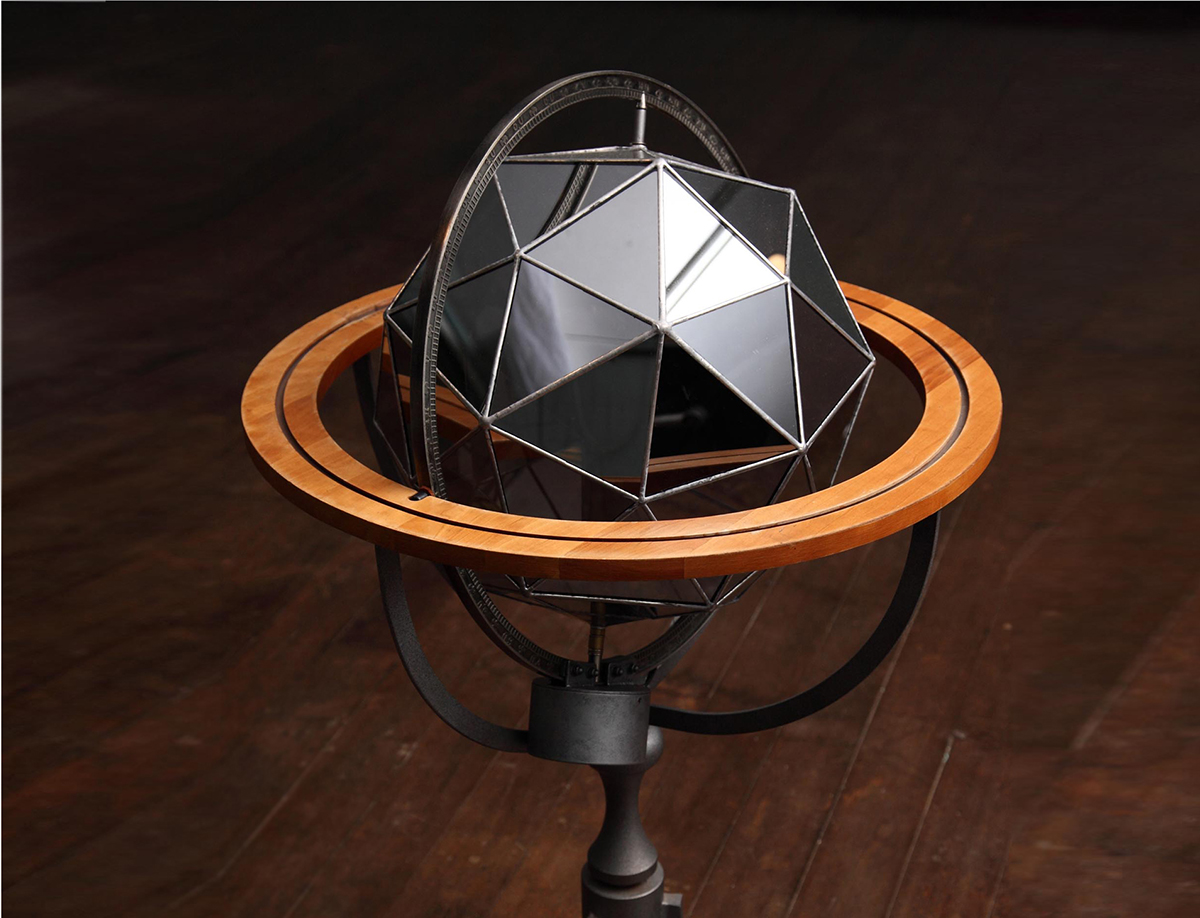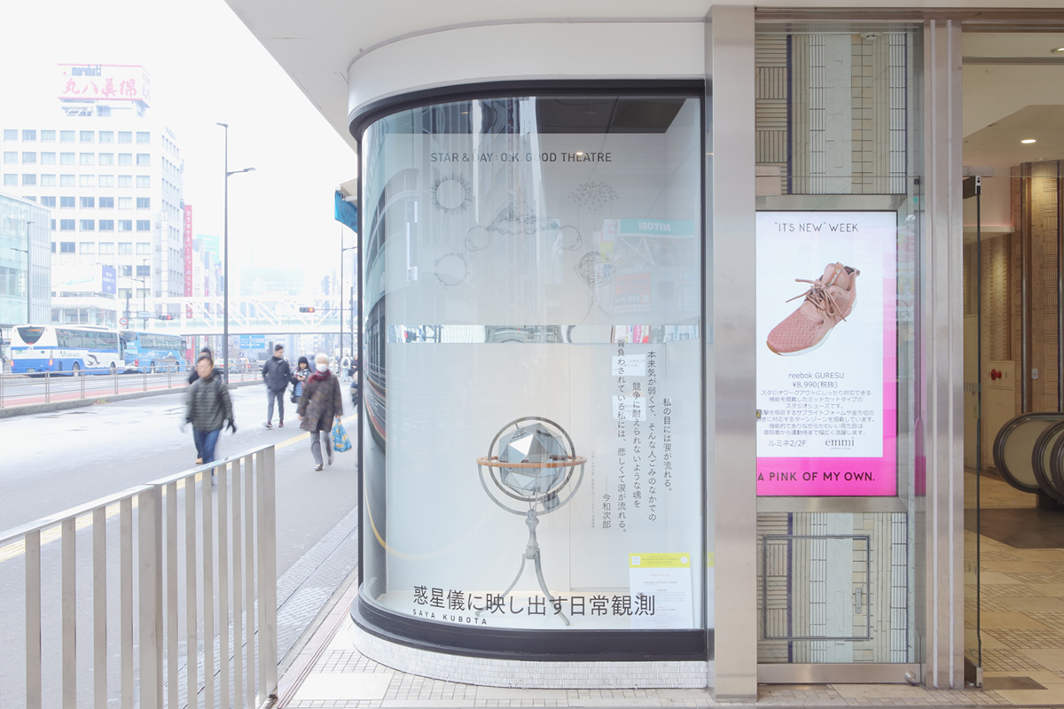 惑星儀に映し出す、23日間だけの日常観測。新宿の町並みを撮影した映像を惑星儀に投影し、ウィンドウ内に反射させて風景を増幅させます。