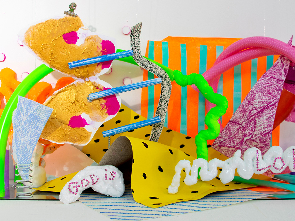 部屋にある何気ない布や花瓶を眺めていると、壮大な砂漠や巨大なビルのような景色が浮かんだ。それを一度絵画に起こすことでただの色と形に分解し、それぞれのピースを3次元で再構成する。今回は砂漠に突如現れたカラフルな砂の丘「サルベーションマウンテン」をモチーフに、そこに近未来的な都市イメージを重ねたインスタレーションを制作。ルミネのショーウィンドウに半立体の絵画作品として展示する。