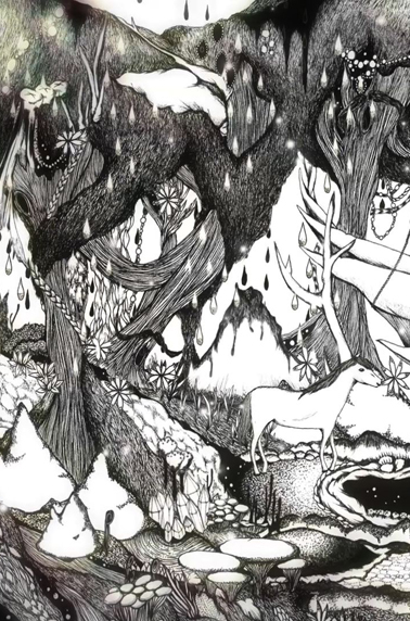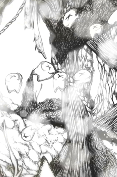 自ら発生させたものが成熟し、やがてそれに飲み込まれて消えてゆく、そしてまた発生していく循環の世界を、ひとつの森に投影し音楽と映像とともにハンドドローイングによって描きました。