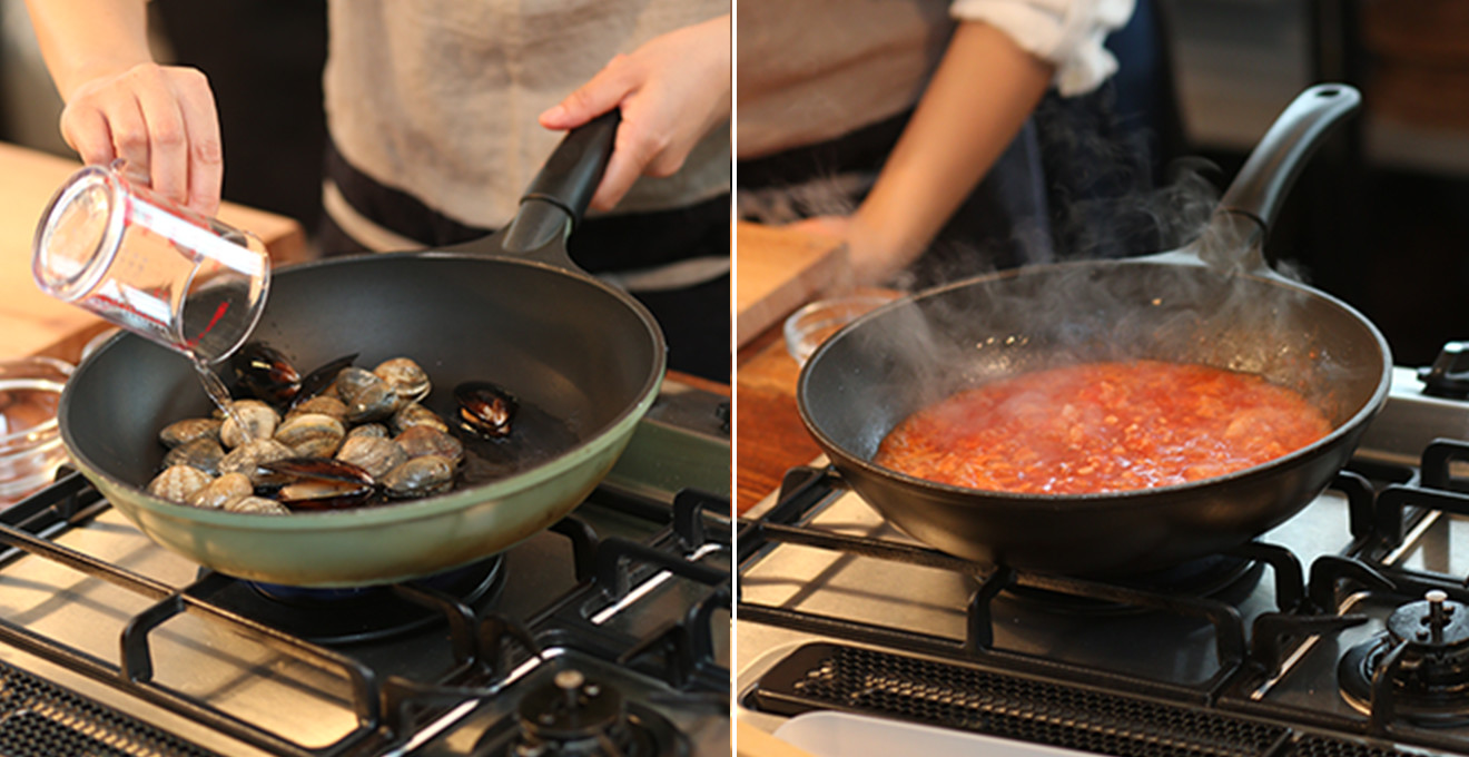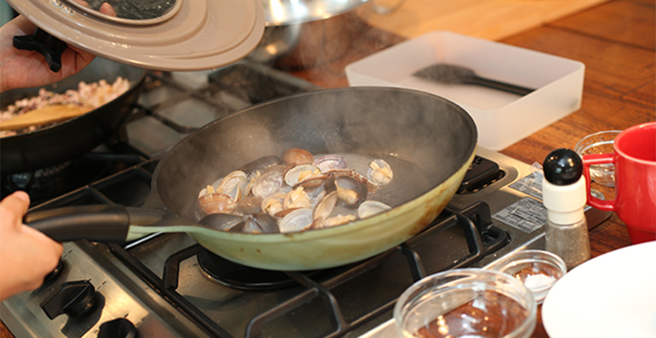 「家庭で作りやすいのはもちろん、見栄えがいいことも大事なポイント」とSHIORIさんの流れるようなトークに、どんどん引き込まれていきます。「ミートソースの魚介版」というキャッチーな紹介から「魚介のラグーソース」作りが始まりました。 だんだんいい香りが立ち上がってきました。美味しそう!