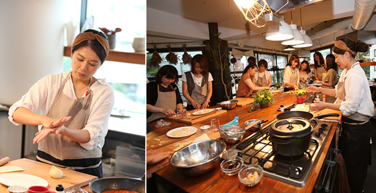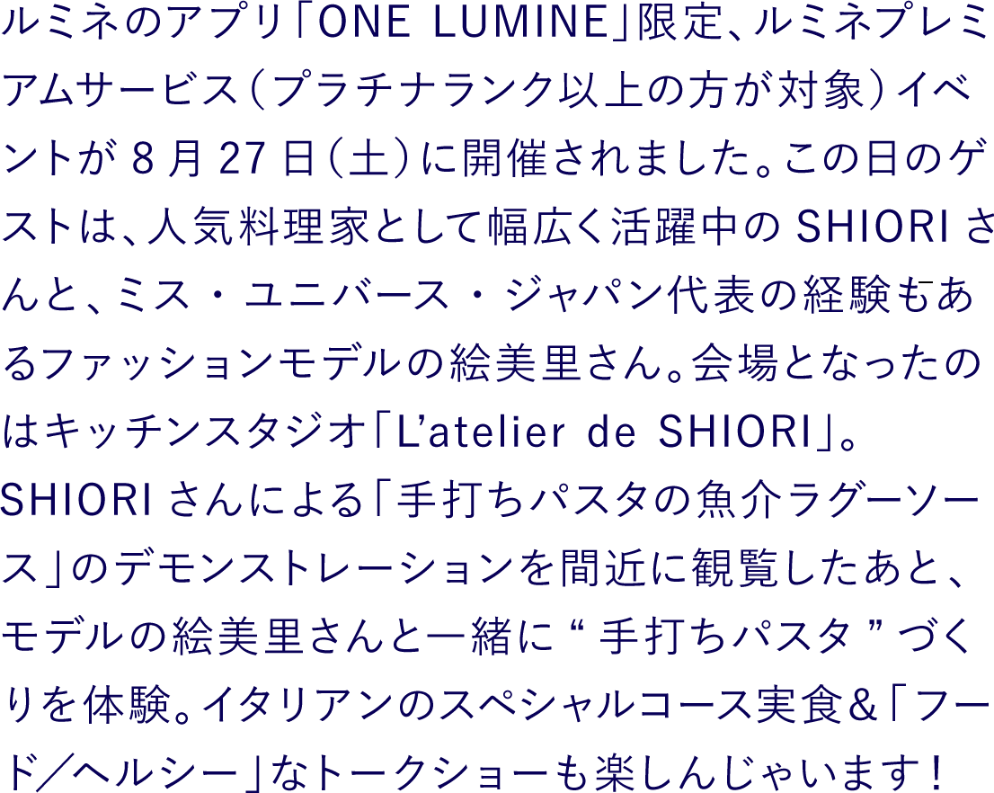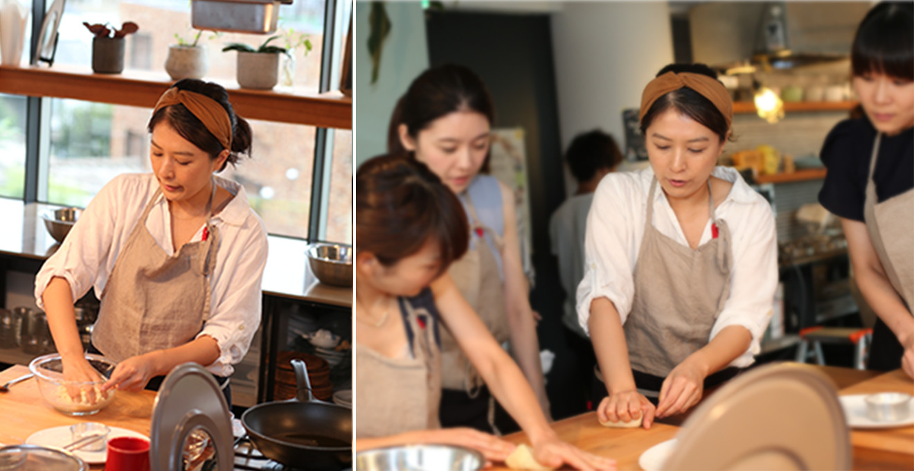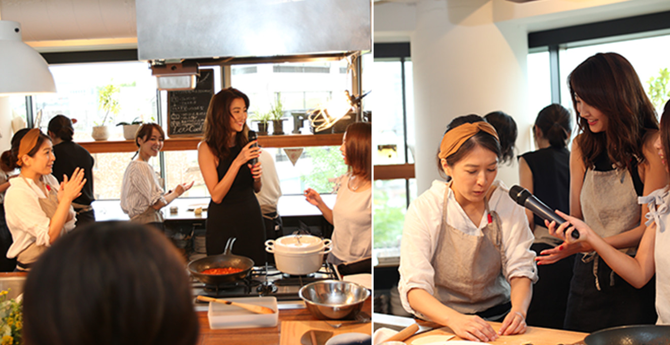パスタが大好きだという、ゲストのモデル・絵美里さん。必ずしもカロリーを気にするわけではなく、「美味しい」と思える範囲でヘルシーなものを選んでお食事されているんだそう。参加者のみなさんと一緒に、SHIORIさん直伝のパスタづくりに挑戦です。