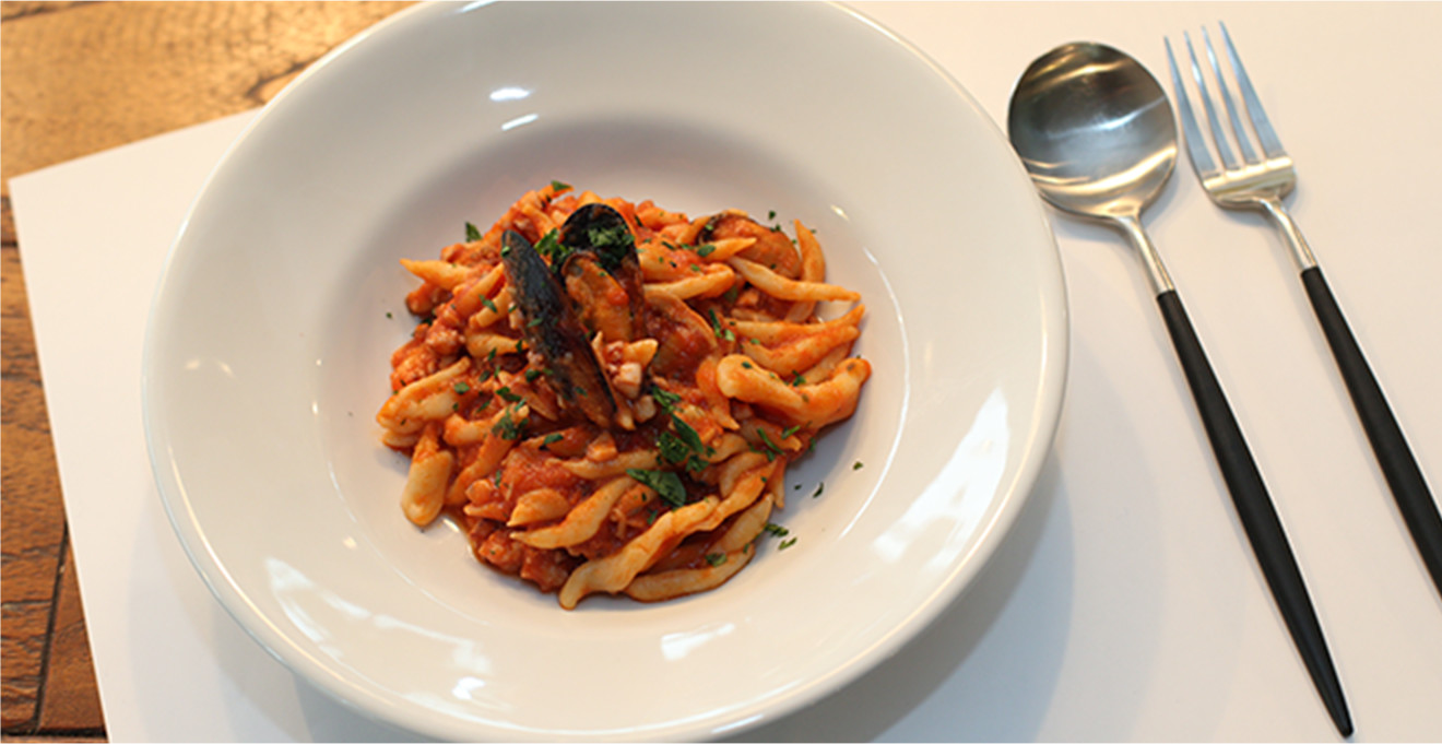 ソースの仕込みが出来上がったところで、先ほど冷蔵庫で寝かせていた手打ちパスタの“タネ”を、茹でる前のパスタの形に仕上げていきます。パスタにはいろんな形がありますが、今回つくるのは「トロフィエ」というもの。「つまんで、ねじって、ほい!」っと、子どもでも遊び感覚で作れるのがポイントと、SHIORIさん。