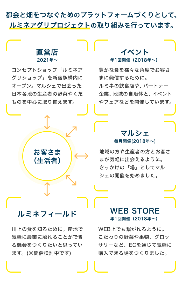 地域の方や生産者の方とお客さまが出会えるきっかけの「場」としてのマルシェ開催や、豊かな食を様々な角度で発信するためにルミネの飲食店や地域の自治体等と連携したメニューフェア等、お客さまに色々なきっかけを提供しております。