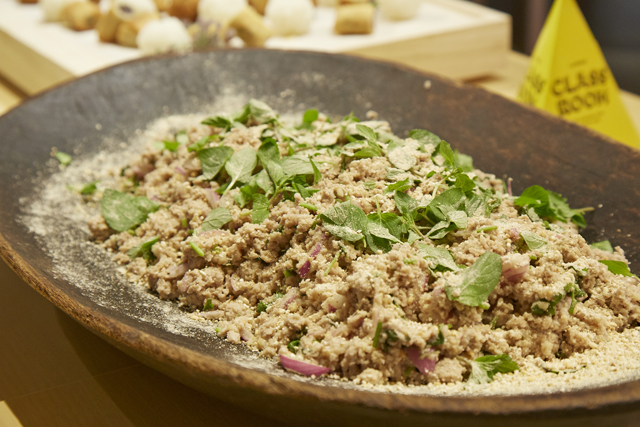 こちらは「ラープ」という、ナンプラーで味付けしたひき肉たっぷりのサラダ。タイやラオスで食べられているポピュラーな料理です。