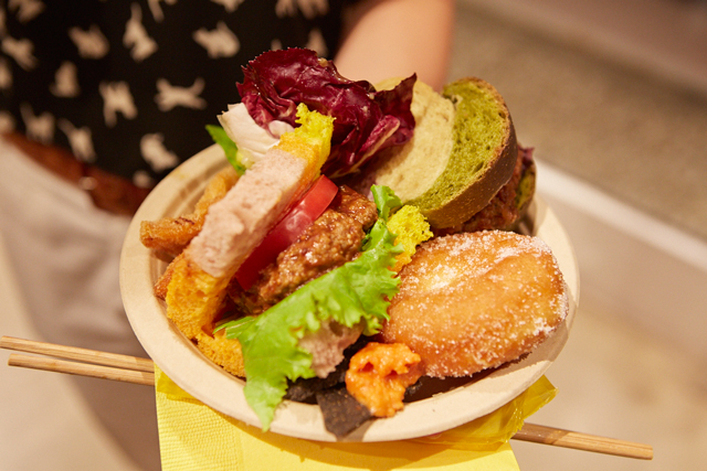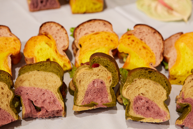 虹を再現したのは、なんともカラフルなパンのサンドイッチ! 赤澤さんの本でも紹介されている、ハワイの「レインボーブレッド」をイメージしたのだそう。具はハンバーグと、タロイモの代わりに里芋を使ったベジバーグの2種類。