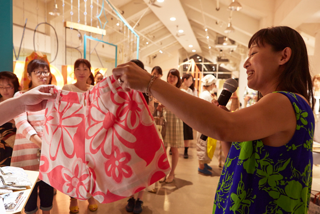 交流会では、赤澤さんが古着のアロハシャツやムームーからリメイクした服や雑貨を紹介する場面もありました。コーディネートを説明しながら「だいたいみんな、水着に合わせられるデザインです」。