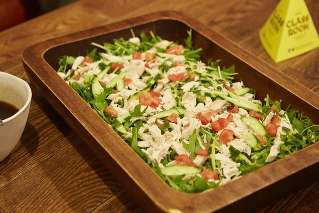 まずは、「ササミと水菜のサラダ」。アスリート飯といえば必須のササミと、夏の時期にぴったりの水菜に、お好みでノンオイルの青じそドレッシングをかけていただきます。