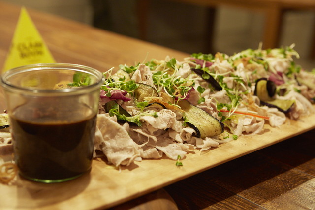 メインディッシュは「オレンジバルサミコソースのぶたの冷しゃぶ」。豚肉は、ビタミンB1とタンパク質を多く含むため、疲労回復におすすめ。ソースは、疲労回復に効果的なオレンジジュースとバルサミコを合わせたもの。甘酸っぱいソースで、普段食べる冷しゃぶとはまた違ったおいしさが楽しめます。