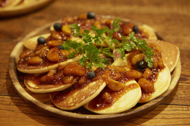 そして最後、デザートは「バナナキャラメルソースの米粉のパンケーキ」。小麦粉の代わりに米粉を使用しているため、モチモチした食感が特徴です。