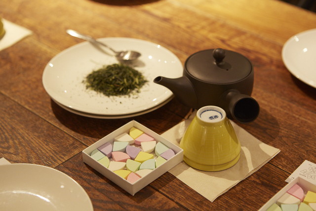 ここからは、「お茶会」がスタート。山口県の「かりがね茶」を、熱湯、お水、冷ましたお湯の3種類の淹れ方で味わうことができます。まずは熱々の熱湯で淹れたお茶の味から。
