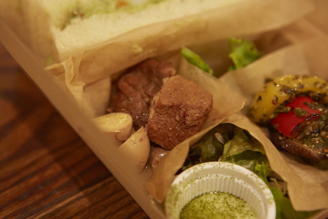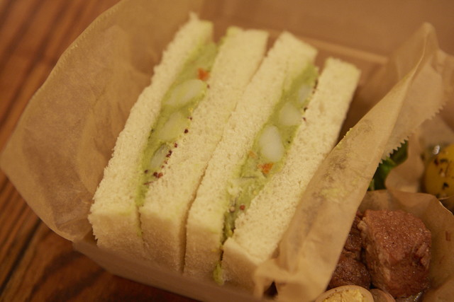 サンドイッチの具材は、緑色のポテトサラダ。実は抹茶が練り込んであります。