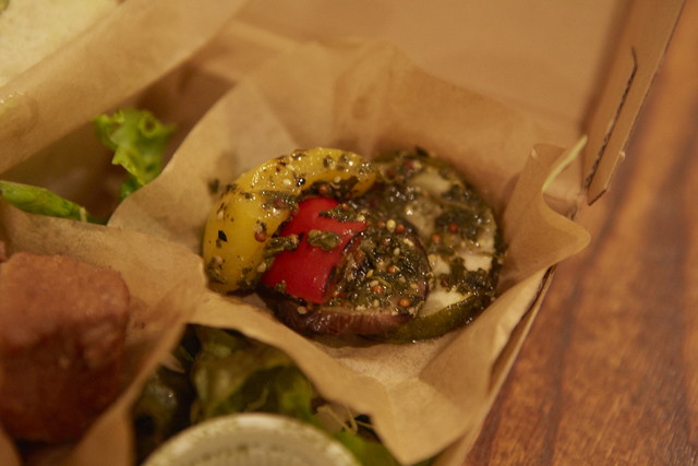 夏野菜を使った料理は、ナス、ズッキーニ、パプリカをグリルしたもの。さらに、抹茶と一緒にマリネしています。