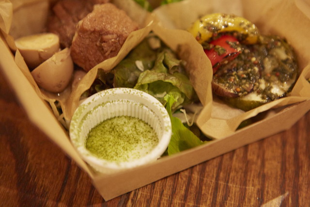 そして、サラダのドレッシングも抹茶味。とことんお茶にこだわったお弁当です。