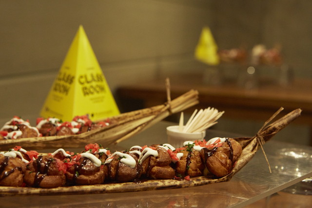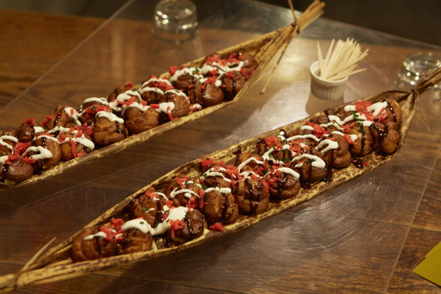 デザートに登場したのは、なぜかたこ焼き……ではなく、たこ焼き風のシュークリーム。チョコレートをソースに、生クリームをマヨネーズに見立てていますが、紅しょうがだけは本物! 絶妙なマッチングです。