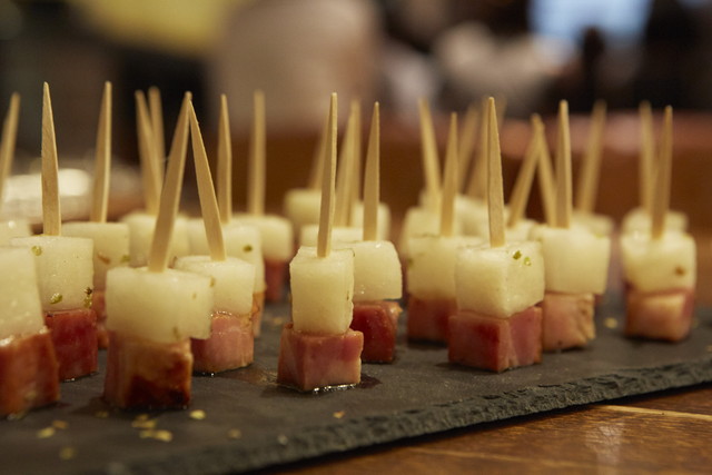 まず、一品目はベーコンと旬の梨を組み合わせたピンチョス。果物のシャキシャキ感と弾力ある肉の触感の“違和感”を楽しめる前菜です。