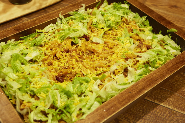 こちらは肉と豆をスパイシーに煮込んだチリコンカンのパスタ。一般的にはトルティーヤやタコライスなどに使われる具材を、シャキシャキのレタスとともにパスタでいただきます。
