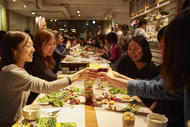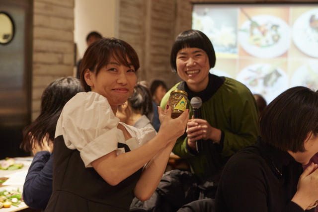 作品発表のあとは、実食タイム。自分で盛り付けた野菜を、お酒とともにいただきます。