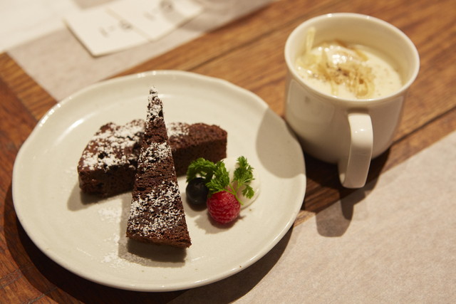 淡路島産のたまねぎだけを使った甘いポタージュと、粗みじんにしたビーツを混ぜ込んで焼いたガトーショコラも用意。前菜・メイン・デザートと、野菜のフルコースがこれで完成。