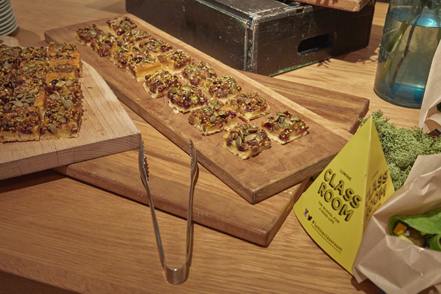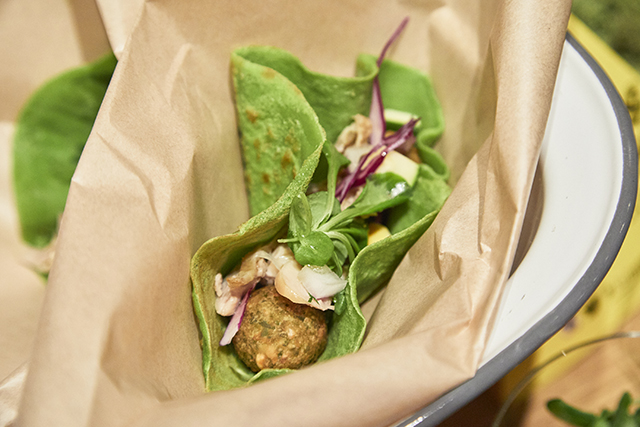 二つ目は、グリーンピースのクレープ。当日にグリーンピースをひいて粉からつくったクレープ生地には、サイコロ状にカットされたチキンや、マメをベースにしたコロッケみたいな食感のファラフェルなどがくるまれていました。ポップな見た目とはギャップのあるしっかりした食べ応えに、参加者の皆さんも大満足です。