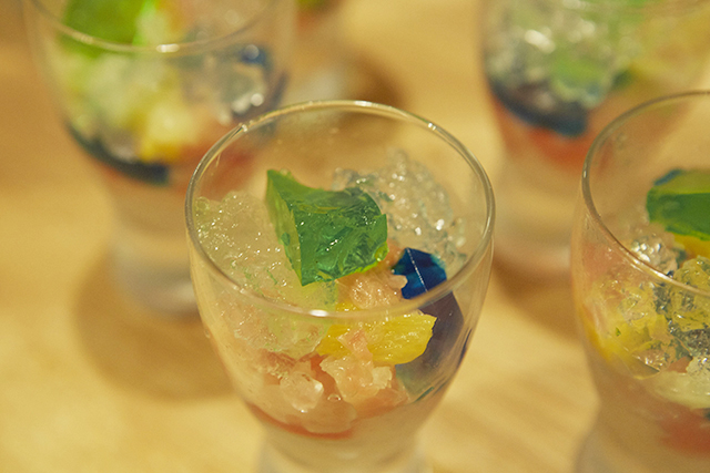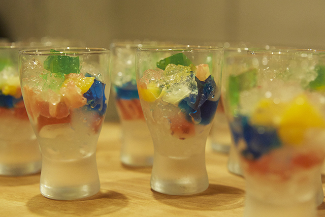 デザートは、宝石ゼリー。まるでアクセサリーを詰め込んだ宝石箱のようなグラスは食べるのが惜しくなるような輝きを放っていました。いちご、キュウイ、グレープの酸味と甘味で会場のみなさんに笑顔が。