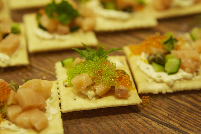 これは魚介と野菜のカナッペ。彩り豊かな食材を宝石に見立て、ブローチをイメージ。クリームチーズのミルキィな味わいが口中に広がって、シャキシャキ、パリッとした食感に心が踊りました。