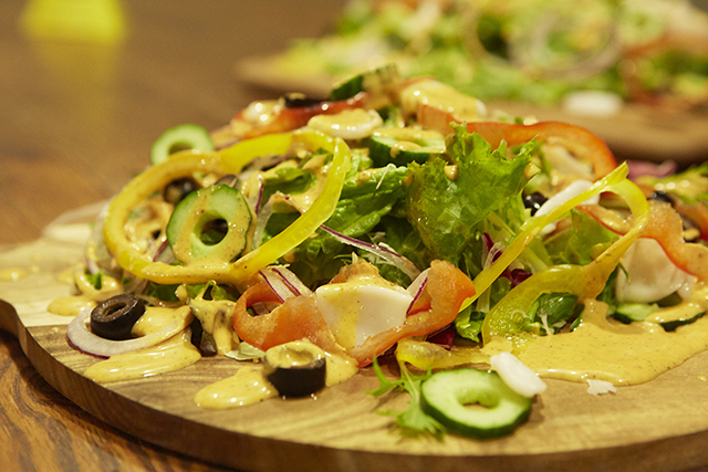 サラダにはイカリングやレッドオニオンといったリング状の食材をそろえて、指輪をイメージ。きゅうりやパプリカの歯ざわりと、オリーブの濃くで、ヘルシーかつ味覚も大満足。