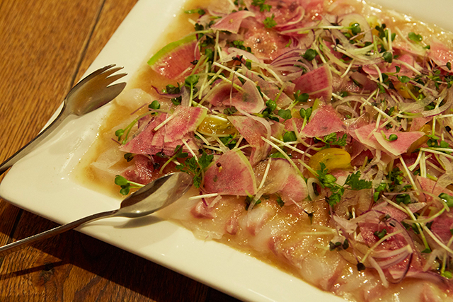 今回のお料理は、どれも昔から愛されているメニューに現代のエッセンスを取り入れた逸品です。こちらは鯛のカルパッチョ。サラダ仕立てで、新鮮な野菜と一緒に、有機玉ねぎのソースを絡ませていただきます。鯛の風味が香ってきて、口に爽やかさが広がりました。