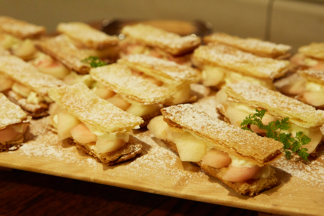 デザートは桃のミルフィーユ。「タイムレス」にあやかって、年輪をイメージしたスイーツです。桃の甘さはしつこくなく、添えられたクリームソースも優しい甘み。ちょうどいい生地の食感と心地よいハーモニーを奏でていました。
