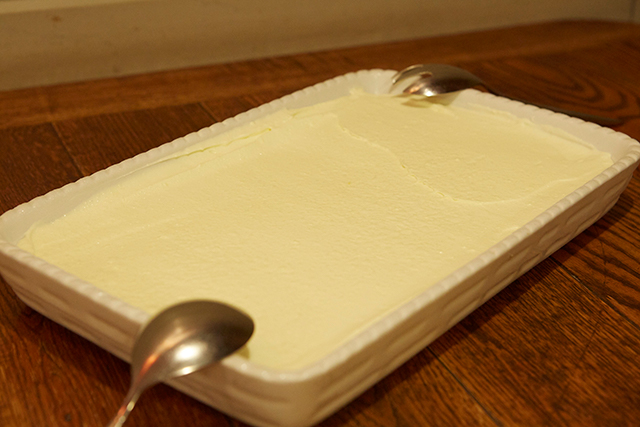 デザートはレアチーズケーキです。そこにしみていたレモンが濃い味で、食後に清涼感を感じさせてくれました。チーズとレモンのしみたスポンジ部分をスプーンで混ぜながら食べても、とっても美味しいケーキでした。