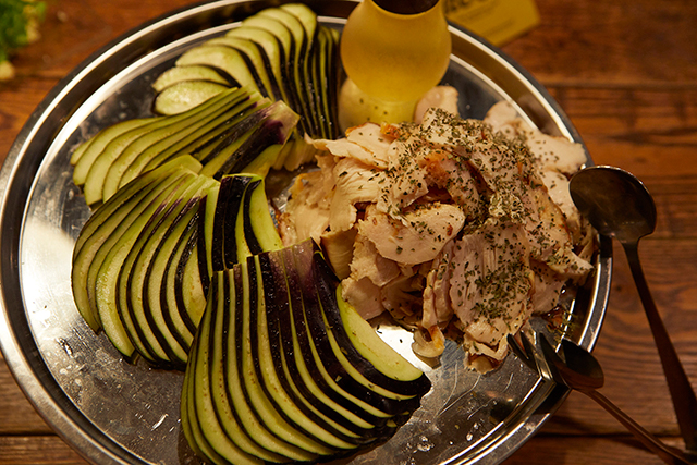2品目は「水なすとチキンのカルパッチョ 水のソース トマト風味」です。大阪府の泉州エリアで採れる水なすにチキンを合わせ、水のようなトマトソースをかけて味わいます。透明なソースが舌のうえに触ると、切りたてのトマトをかじったような風味が、ほんのり。