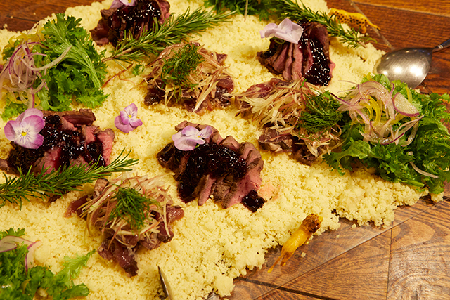 3品目は、ずばり「オアシス」。出汁で炊いたクスクスは砂漠。そのクスクスに点在する具材「かつおのたたきと和ハーブ」「牛肉の洋ハーブ焼き ハスカップソース」「わさび菜とカラフル野菜のマリネ」はオアシスです。オアシスのなかから、かつおのたたきをいただきましたが、クスクスと一緒に頬張ると魚介の味わいを豊潤に堪能できて、ぐいぐい食が進みました!
