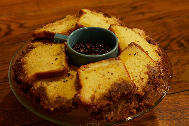 そして、デザートは「コーヒーのパウンドケーキ」です。シュトロイゼルというそぼろ状のクッキーを砂に見立て、苦味の少ないコーヒーの控えめな甘さとクッキーの食感が良い感じ。甘いものが苦手な人でもおいしいと思えるような優しい美味でした。