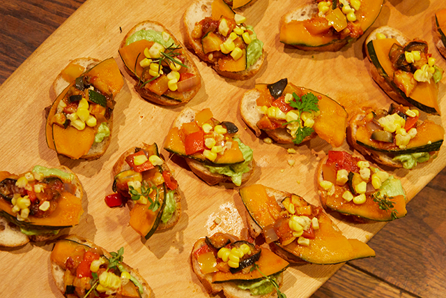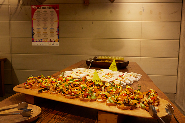 1品目は、「夏野菜のオープンサンド」。2019年フジロックに出演する、ジェイソン・ムラーズが家族で農園を運営していることからイメージした逸品です。フランスパンのザクザク感と、野菜のジューシーな味わいに、思わず「うまい」の一言が漏れました。遅れて広がってくるカボチャ風味もいい感じ。