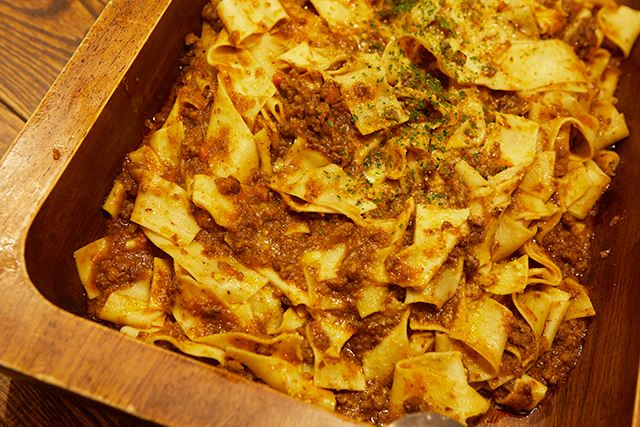 3品目は、「ミートソース パッパルデッレ」。モチモチっとした食感の平麺に、トマトとミートの濃厚なソースが絡み、胃も心も大満足なメインディッシュです。2019年フジロックに出演する、エルレガーデンの名盤『RIOT ON THE GRILL』のジャケットから創作されました!