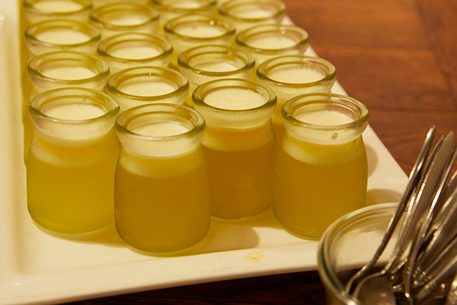 デザートは、「蜂蜜レモンゼリー 〜フェスのビール風〜」。2019年フジロックに出演するトム・ヨーク所属バンド レディオヘッドの1stアルバム『パブロハニー』にちなみ、ハチミツを使用。レモンベースの味わいに、蜂蜜の甘みが重なって、夏も食べやすいスイーツになりました。ビールに見立てた泡の部分まで、しっかりレモン味。ゼリーを固める前の泡立てで、ビールの気泡を再現したのだとか。
