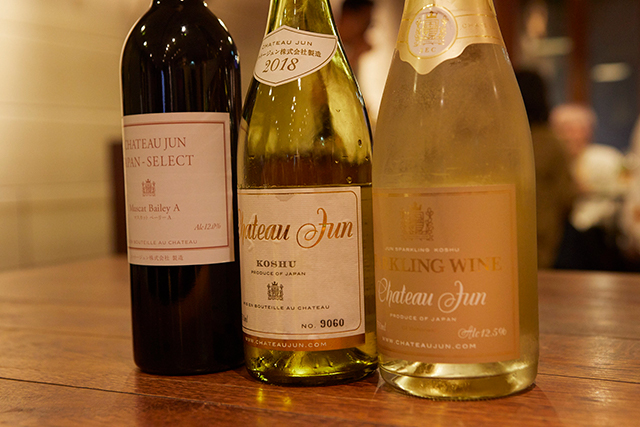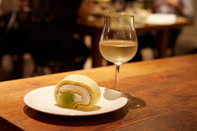 3品目は、ロールケーキにジュン スパークリングを合わせます。旬のフルーツを美味しくいただくのに打ってつけのロールケーキには、ナガノパープルやシャインマスカットが包まれていました。卵風味を十分に残すスポンジのしっとりした食感とスパークリングワインの弾ける刺激についフォークが進んでしまうワクワク感。西浦さん曰く、1品目に味わった甲州2018の泡ものだと言うジュン スパークリングの気泡のリズムに、会話も弾む体験でした。