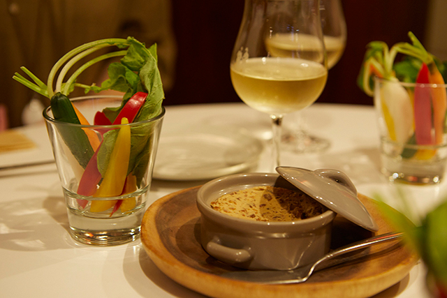 1品目は、野菜スティックに奈良漬けとクリームチーズを和えたディップを添えて。それに、G20大阪の首脳夕食会でも振る舞われた、シャトージュンの白ワイン「甲州2018」を合わせます。2019年にNIPPON OMIYAGE AWARDで食品部門 農林水産大臣賞を受賞した、奈良漬け×クリームチーズの「サロン・ド・アンブレ」には、複数種類のフレーバーがあり、この日はゆず風味をチョイス。ゆずが奏でる柑橘と甲州2018とのマリアージュに、1品目からワインがもたらす食卓の豊かさを実感できました。