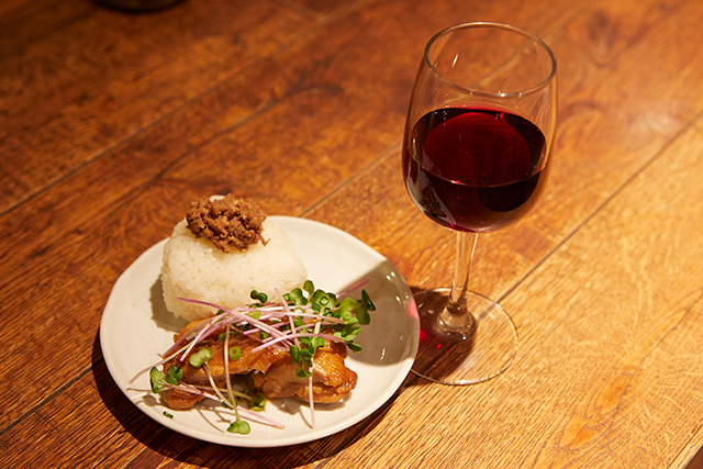 2品目は、日本を代表する黒ぶどう「マスカット ベーリー A」を使用した赤ワイン。意外にも、チキンの照り焼きと肉味噌おにぎりに合わせていただきました。マスカット ベーリーA特有の甘やかなキャンディー香からは想像できない、やさしい味わいのワインが醤油の香ばしさと相待った美味しさは未体験なもの。プリプリのお肉やもっちりしたおにぎりの食感に口中も喜びが溢れました。