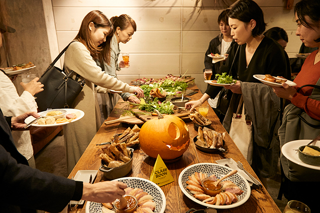 10月講座の交流会には、引田さんのリクエストに沿って「旅」というテーマの料理を恵比寿・カフェパークが用意しました。そのテーマに、CASICAで大事にされている「変化していくもの同士の今の価値観を空間に可視化すること」や「意外性のある組み合わせ」を見せることを掛け算した料理を楽しみつつ、参加者との親睦を深めました。