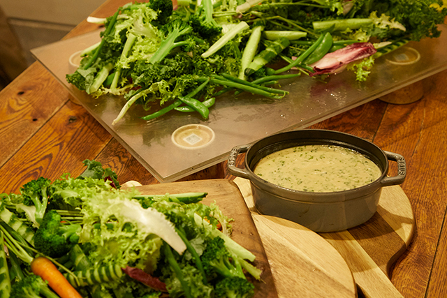 1品目はバーニャカウダ。料理人が深い思い入れを持つ神奈川県湘南平から見た、緑豊かな海岸線をイメージした料理です。しっかりした味付けのソースでしたが、野菜の食感を味わった後に味がスッキリ消えて、次の野菜をまた口に運びたくなる一品でした。