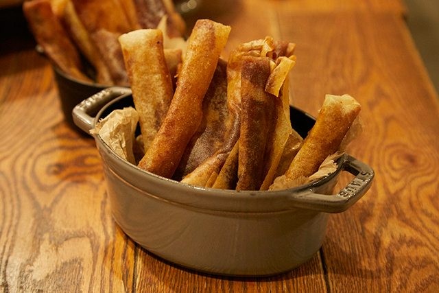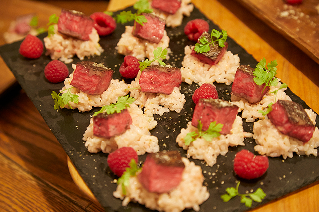 2品目は栗の春巻きとフランボワーズのリゾット、そして牛肉のロティです。意外性のある食材を一つひとつの料理に仕上げました。栗の春巻きにはバルサミコ酢が合わさり、甘みを深めています。口に入れるとフランボワーズの風味が鼻孔まで届くリゾットとトリュフが香る牛肉のロティは、一緒に食べるとファンタジックな世界の一員になったような、未体験の味わいを感じられて、食べることが楽しいと思えました。