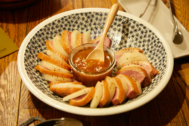 3品目は鴨と梨のスモーク。参加者が料理を取る目前までスモークしていた鴨と梨に、マンゴーソースを絡めていただきました。スモークの風味、鴨肉に梨とマンゴーのフルーティーな味覚が重なって、1品でいくつもの料理を食べたような満足感でした。