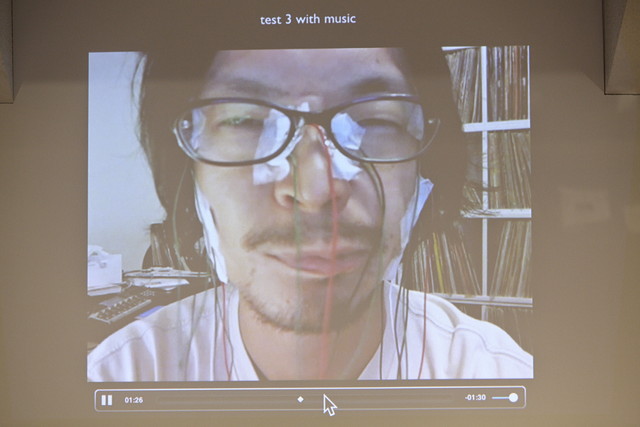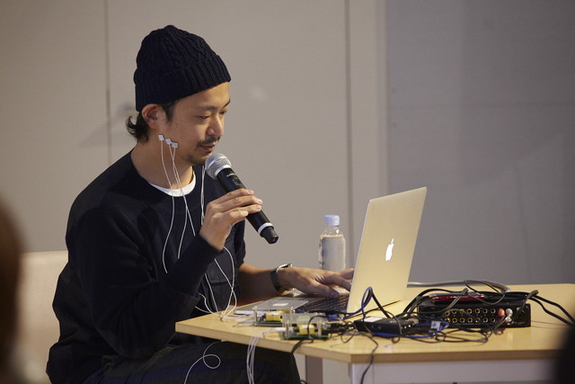 今回、会場に持ってきてくれたのは、「Electric Stimulus to Face」で使っていたのと同じ電極やセンサーなど。実際にそれを装着して、自分自身の顔で実演してくれました。真鍋さんの口もとがピクピク動く様子に、会場からも笑いが。
