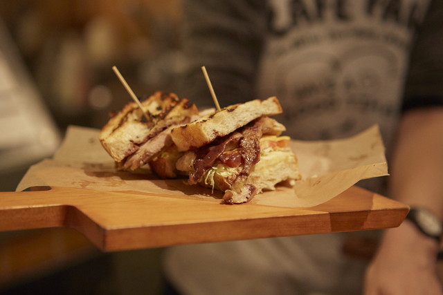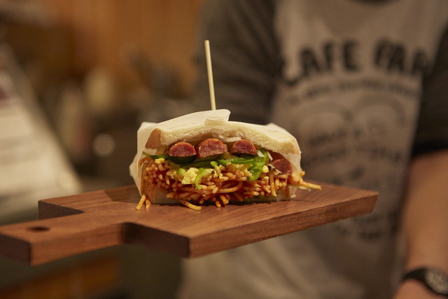 こちらは、小谷さんの好きな喫茶店をイメージしたサンドイッチ。ナポリタン、スクランブルエッグと喫茶店定番のメニューを挟んで、流行りのボリュームサンドに仕上げています。新しいものと古いものが重なり合う様子はまさに東京の街のよう。