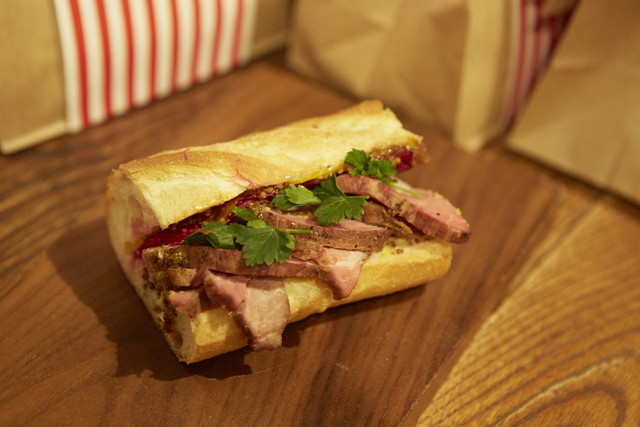 平野さんのお題は「シティーガールサンド」。ハーブローストポークにオレンジソースが添えられ、ビーツが彩るサンドイッチは、平野さんの挙げた「シティーガールの好きなもの」を詰め込んだメニューです。