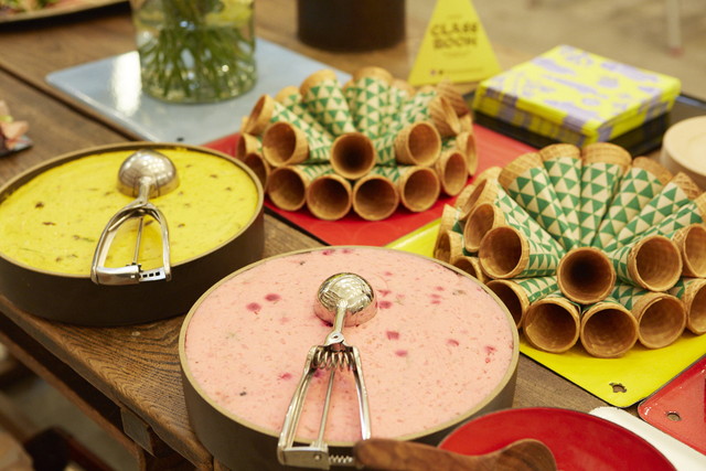 用意したメニューは3品、ひとつ目はアイスクリームに見立てたサラダ、黄色はカボチャで赤はビーツ。コーンに盛っていただきます。