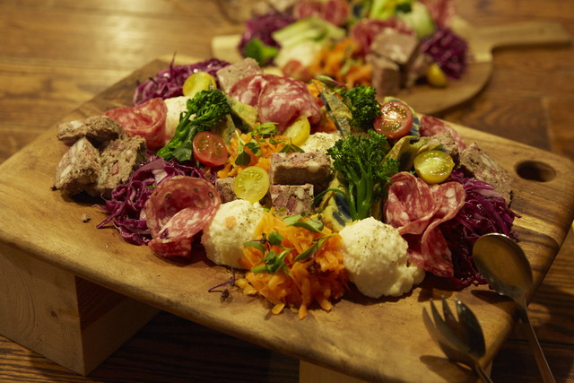 まず一品目は、食材の“個性”を楽しむ盛り合わせ。くるみと紫キャベツのマリネ、ポテトサラダ、自家製パテ・ド・カンパーニュ、スパニッシュオムレツなど5種類の前菜がひとつのお皿の上で個性を主張しあっています。
